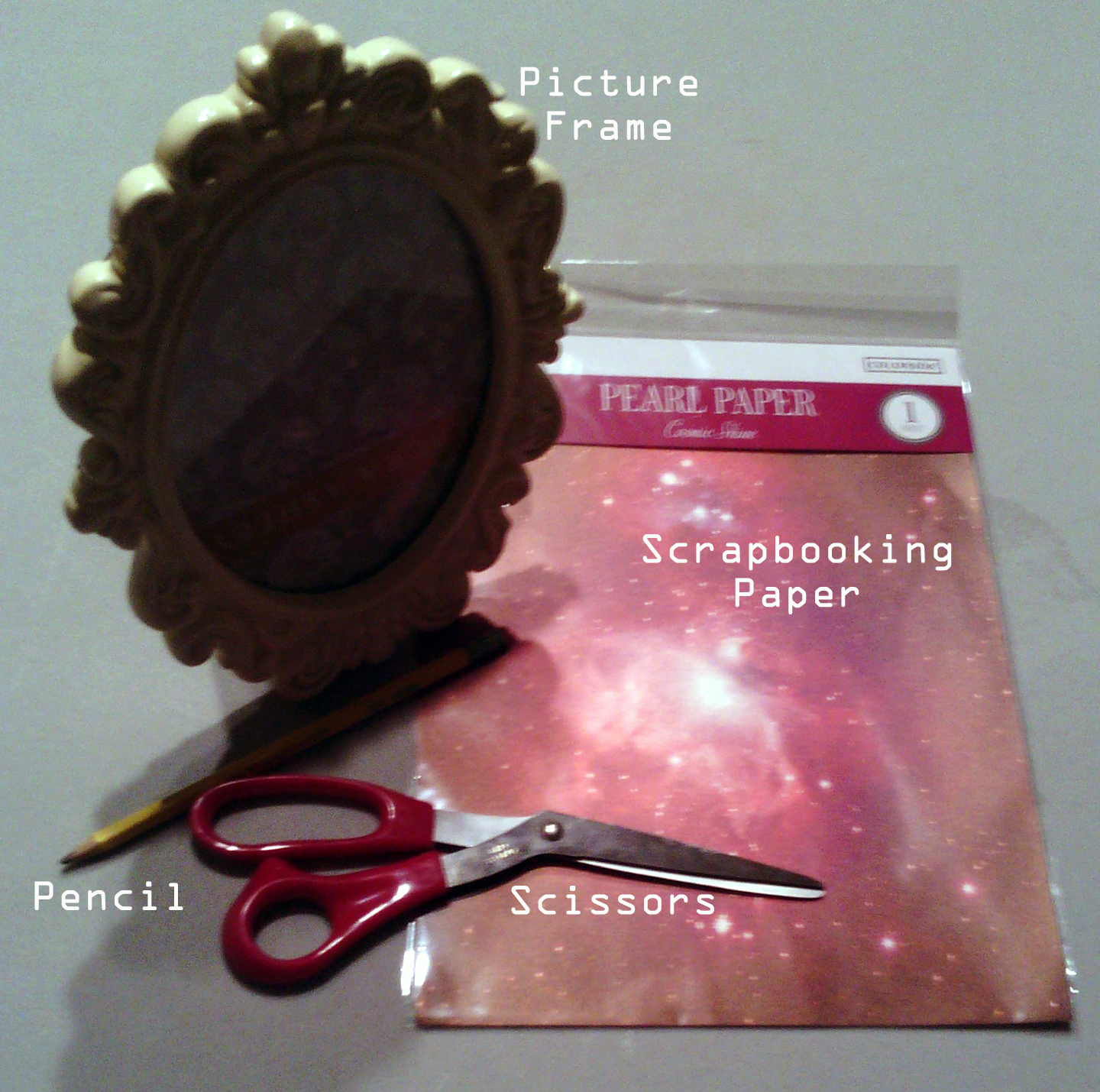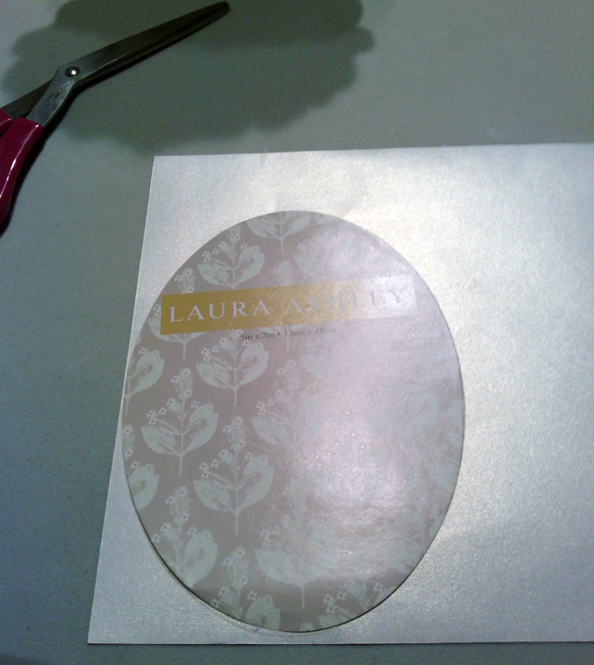 All you have to do for this project is take the fake photo out of the frame, draw a circle on the scrapbook paper of your choice, cut it out, and place said paper into the frame.