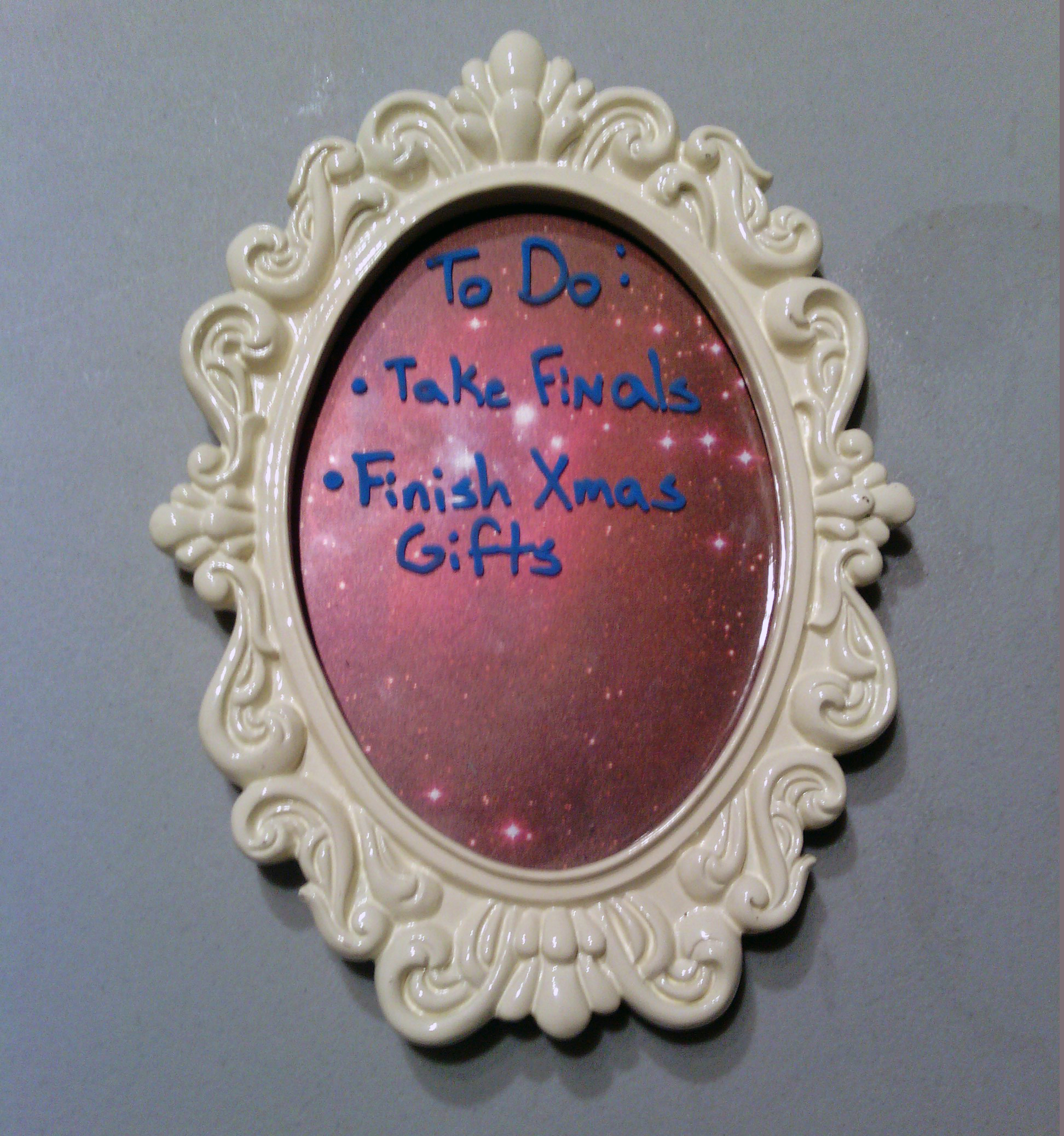IMG_20141209_062020There you have it! A quick yet cute Dry Erase Board! This definitely helped me become unstressed last night. And this morning I had a cute spot to write down my To-do List for today.