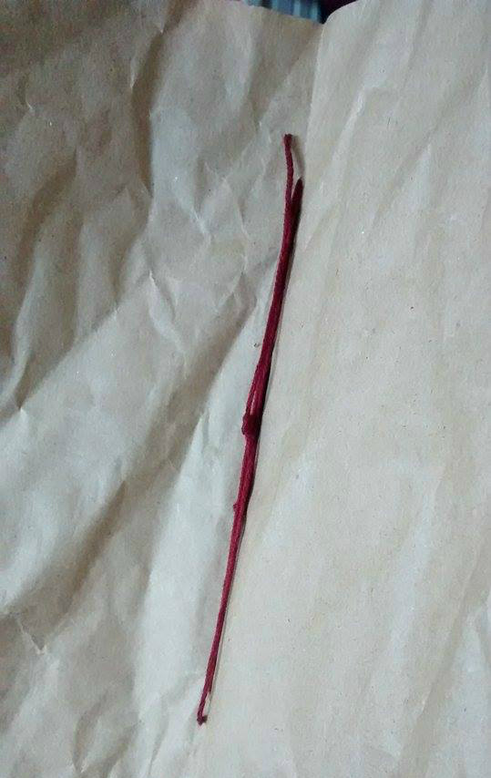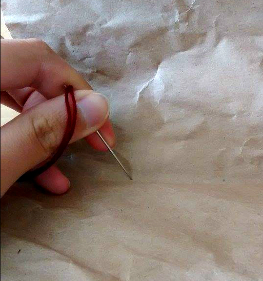 Step 5. I only needed a little over a foot of embroidery thread for this small book, so I prepped it and began sewing the spine. This was done by connecting the dots. After I was done I tied a knot so that it rested on the inside of my book.