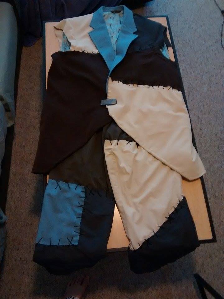 This outfit was created by buying a pair of pants and a jacket at Goodwill. Then I went to Hancock Fabrics (I love that store) to collect a random collection of fabric, about half a yard in each color. After we got back, I made my boyfriend put on the suit and outlined where I wanted the patches to be at based off a reference photo. Over these past few weeks I have been sewing on the patches. This past weekend I got some embroidery floss and added some details. We also used clay to create a button for the front of the jacket.
