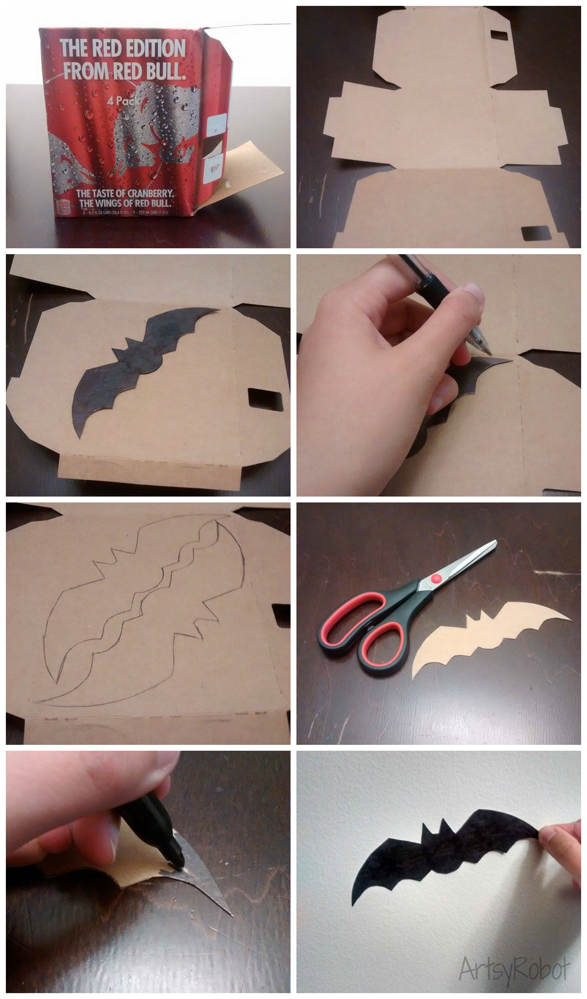 I am so excited to get started on decorating for Halloween! This has been one of my favorite holidays, and so I get really hyped when it comes around each year. For this round, I decided to see how much I could create from reusing old products like cereals boxes and such I use in the kitchen. The first project that I completed was some bats I created from Redbull and Veggie Burger boxes. Below is how I made them!