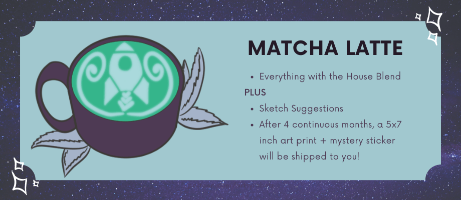 - After four continuous months on this tier, you’ll receive a 5×7 inch art print and mystery sticker in the mail!