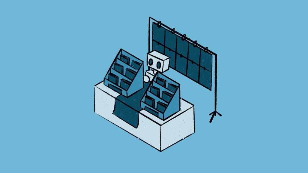 When you see this type of setup, you know you can quickly skim through and find the merch that vibes with you with efficiency. This is great for selling recognizable character prints and greeting cards, for example. The downside is that you only have so much space on your table, so make sure to highlight the favorites at eye level. And you have to keep a lot of your inventory below the table.